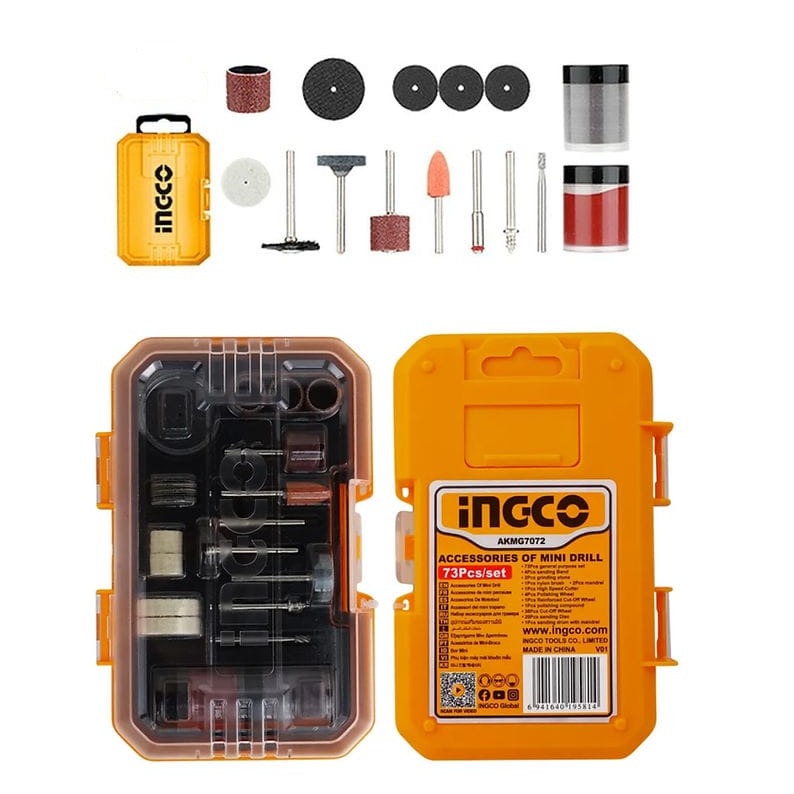 This 73-piece general purpose set includes 4 sanding bands, 2 grinding stones, 1 nylon brush, 2 chucks, 1 high-speed cutter, 4 polishing wheels, 1 polishing wheel, 1 reinforced cutting compound, 36 cutting wheels, 20 sanding discs, and 1 sanding d