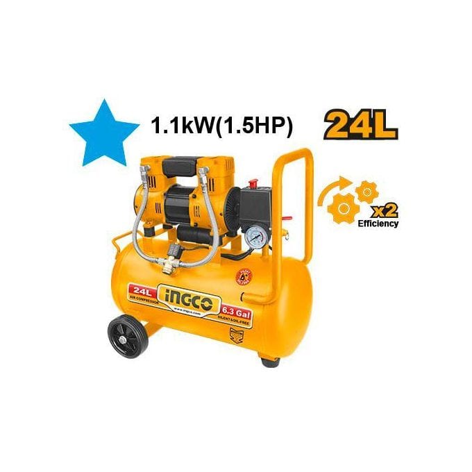The Ingco ACS111242 air compressor features a 1.5HP (1100W) aluminium wire motor powered by 220-240V~50Hz. It includes a 24L (6.3-gallon) oil-free tank designed for efficient, low-maintenance operation. The compressor operates at a no-load speed o