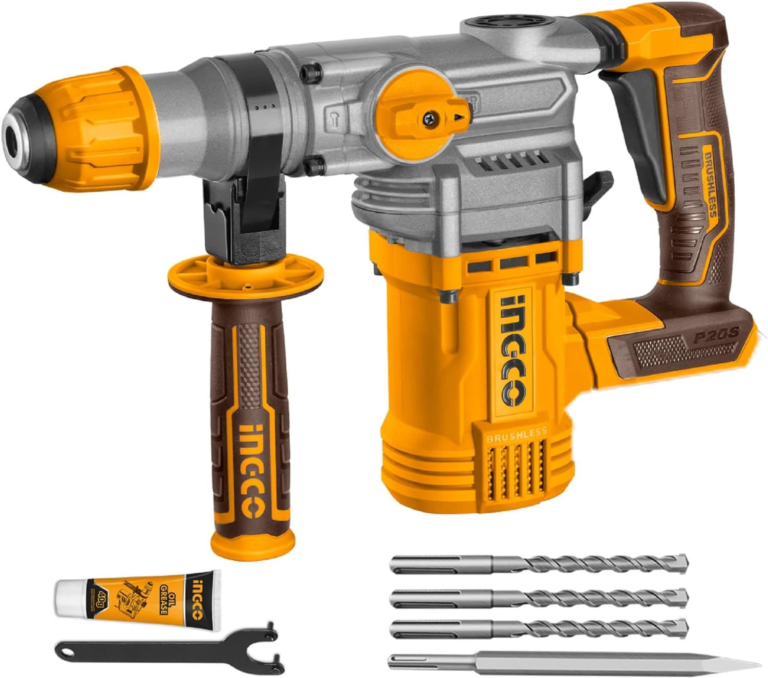 The Ingco CRHLI20288 rotary hammer delivers powerful performance with a 20V brushless motor, making it ideal for heavy-duty drilling and chiseling applications. It features an impressive 4.5J impact energy, a no-load speed of 0–930rpm, and an im