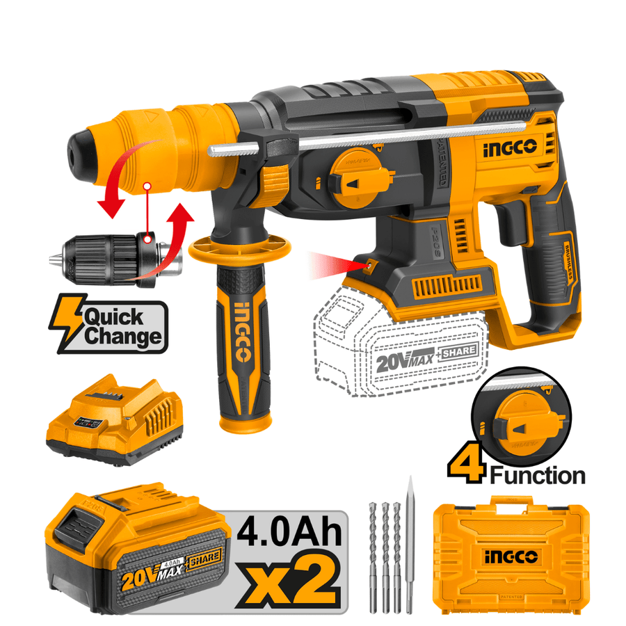 The Ingco CRHLI202289 Brushless Lithium-Ion Rotary Hammer delivers professional-grade performance with a 20V motor, no-load speed of 0?1100rpm, and an impact rate of 0?5000bpm. Generating 2.5 joules of single impact force, it offers efficient dril