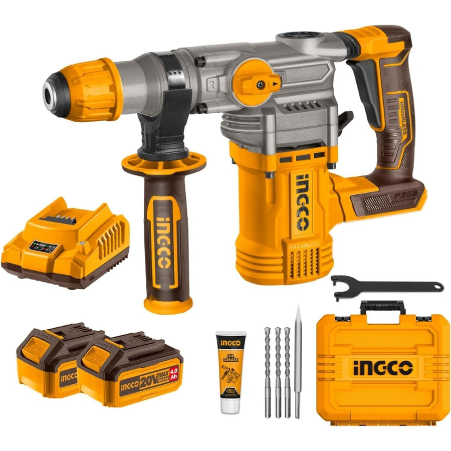 The Ingco CRHLI202882 is a powerful 20V brushless lithium-ion rotary hammer designed for heavy-duty applications. It delivers a no-load speed of 0–930rpm, an impact rate of 0–4400bpm, and an impact energy of 4.5 joules. Equipped with an SDS Pl