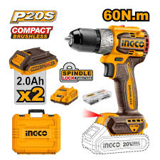 This compact brushless cordless drill operates at 20V with a no-load speed of 0-550/0-2000 rpm and delivers a maximum torque of 60Nm. It features a metal chuck with a 13mm capacity, 22+1 torque settings, an auto-lock keyless chuck, mechanical 2-sp