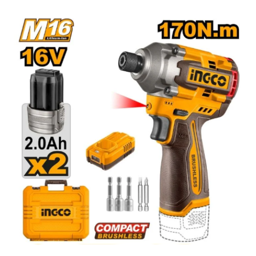 The Ingco Cordless Impact Driver CIRLI16178 features a powerful brushless motor and operates at 16V. It has a 6.35mm hex shank, a no-load speed of 0-2700 rpm, and an impact rate of 0-3500 bpm, delivering a maximum torque of 170Nm. The tool include