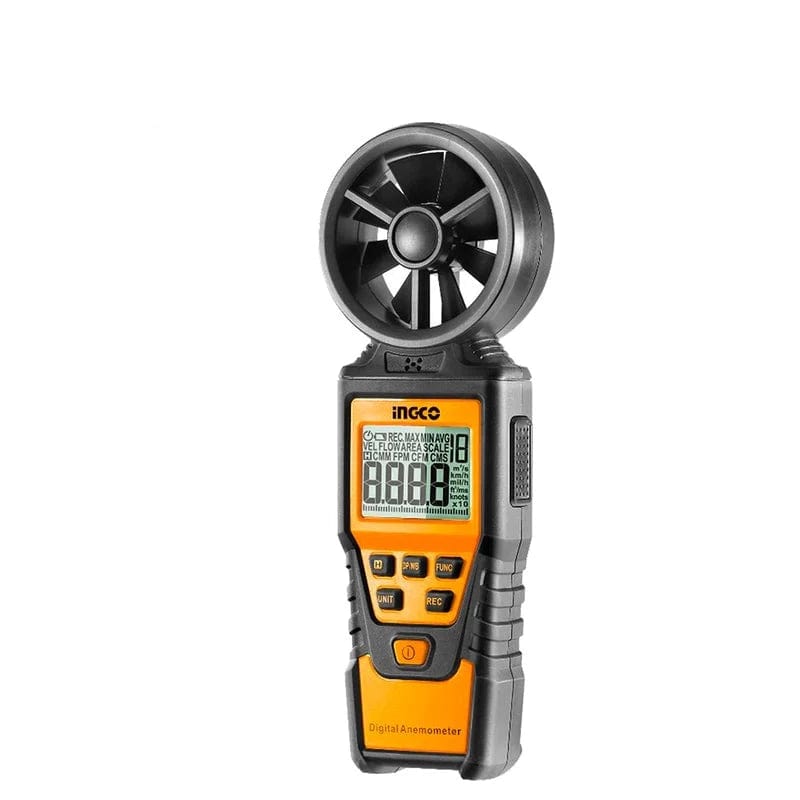This Ingco digital anemometer measures air speed in the range of 0.80 to 40.00 m/s with a resolution of 0.01 and an accuracy of ±(2.0%+30). It features data hold, backlight, and low battery indication functions. The device includes 3 LR03 AAA batteries and is packed by color box.