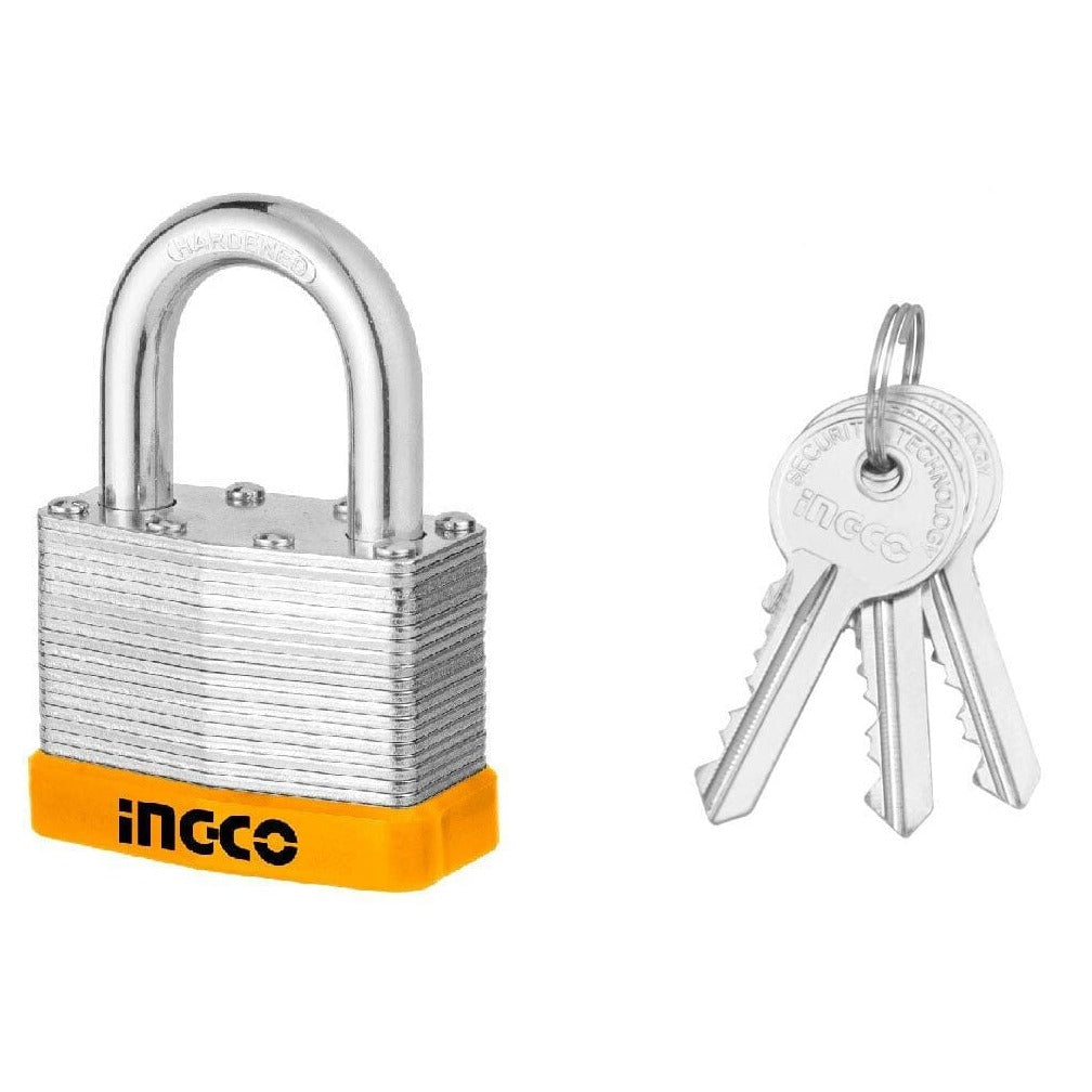 This 40mm Ingco Iron Laminated Padlock features a durable nickel-plated laminated steel body combined with a solid brass cylinder and bolts for enhanced security. It includes an ABS housing that provides impact protection, ensuring long-lasting pe