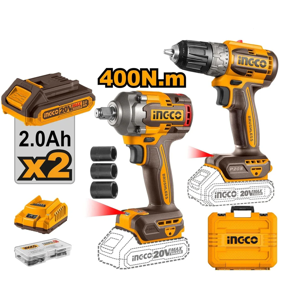 This 20V cordless combo set includes one lithium-ion brushless cordless drill (CDLI20453) and one lithium-ion impact wrench (CIWLI2040). The drill features a brushless motor with a no-load speed of 0-550 to 0-2000 rpm, a maximum torque of 52 Nm, a
