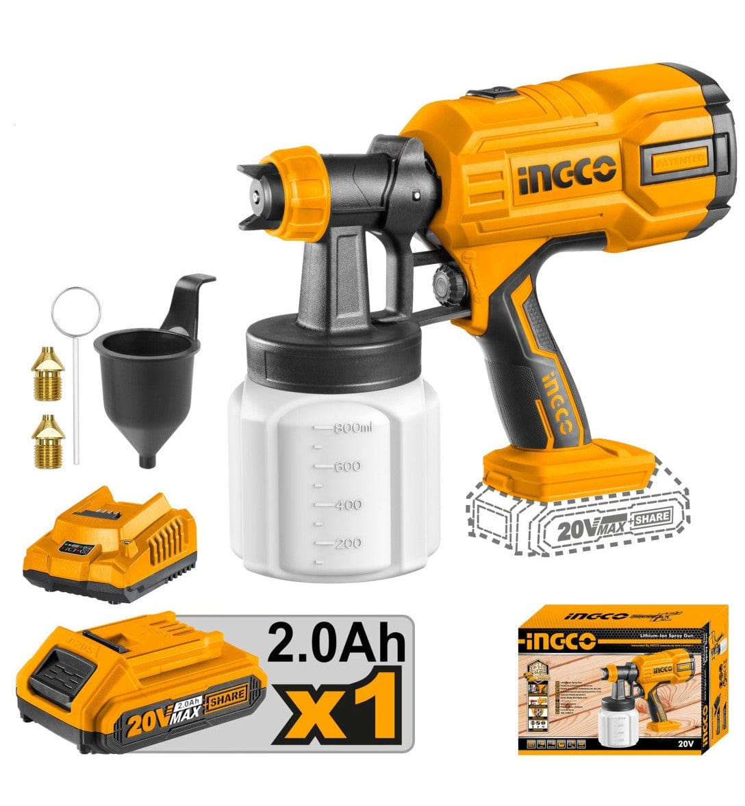 The Ingco CSGLI20406 cordless spray gun is designed for efficiency and convenience in painting tasks. Powered by a 20V lithium-ion 2.0Ah battery, it delivers a spraying pressure of 0.1–0.2 Bar and a maximum flow rate of 800ml/min, making it idea