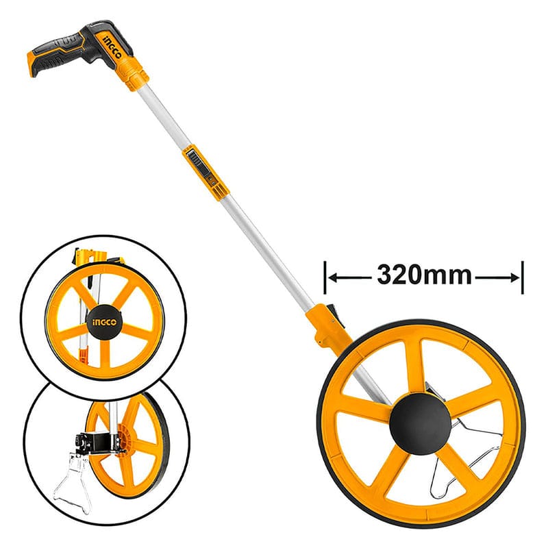 The Ingco HDMW45 Measuring Wheel is designed for precise distance measurement with a display resolution of 0.1 meters and a tolerance of less than 0.5%. It offers a measuring range from 0 up to 9,999.9 meters, making it suitable for a wide variety of outdoor and construction applications. The wheel includes a stand for easy use and stability during measurement. It is packaged securely in a color box for protection and convenience.