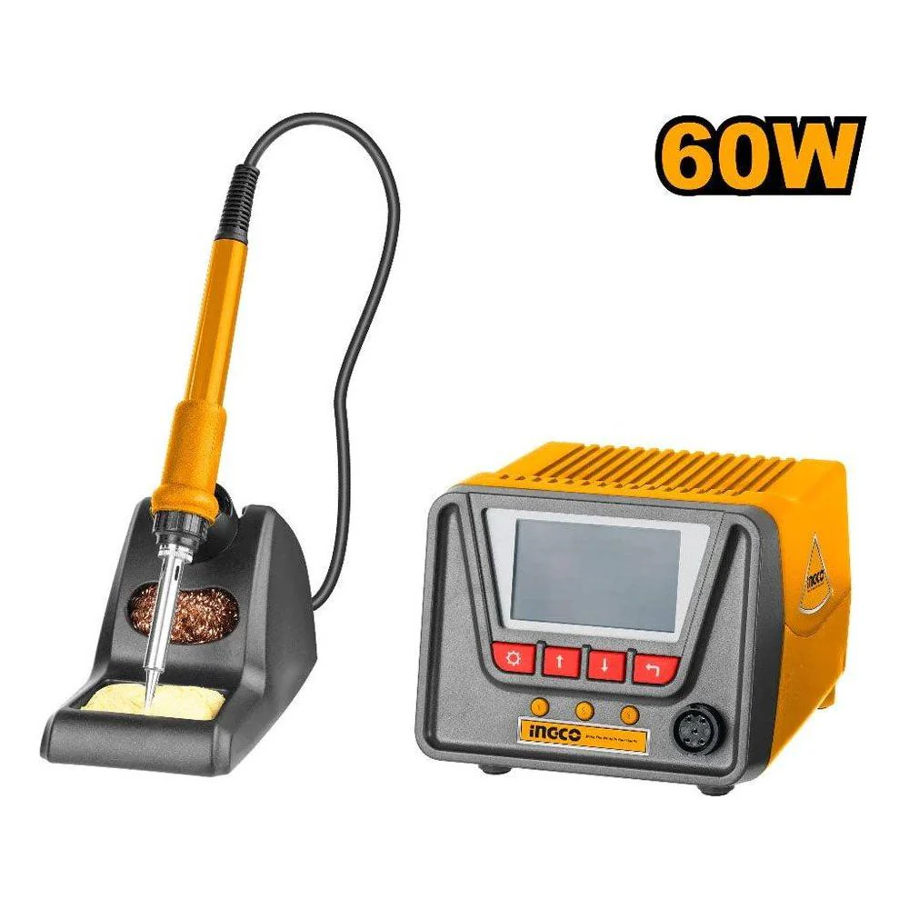 The Ingco SI016923 is a 60W soldering station operating on 220–240V at 50/60Hz. It features a fast preheat time of 1 minute and includes a straight tip head. The station offers a digital display with adjustable temperature controlled by a rotary