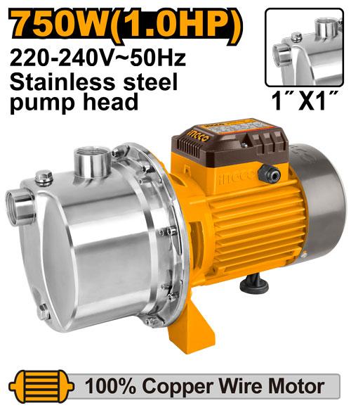 The Ingco JPS075082 is a stainless steel self-priming jet water pump designed for reliable water transfer. It operates on 220–240V at 50Hz with a rated power of 750W (1.0HP). The pump provides a maximum head of 40 meters, a maximum flow rate of