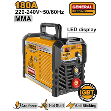The Ingco ING-MMA18028 is an IGBT inverter MMA welding machine that operates on single-phase 220–240V input with a frequency of 50/60Hz. It delivers an output current range of 15–180A with a 45% duty cycle at 180A. Equipped with an LED display
