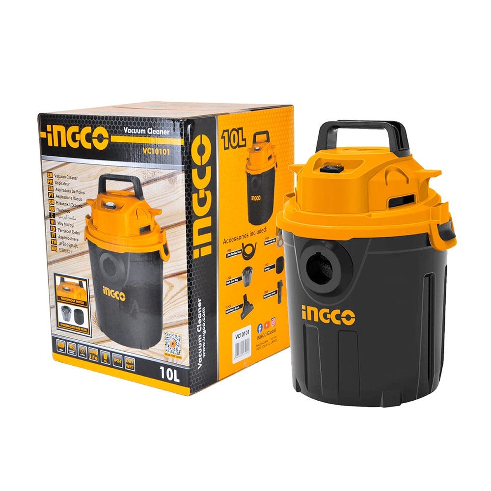 The Ingco Wet & Dry Vacuum Cleaner offers versatile cleaning with a 10-liter dust capacity and a powerful 1000W motor operating at 220–240V, 50/60Hz. Delivering a vacuum pressure of approximately 15 KPa and an airflow of around 1.3 m³/min, it e