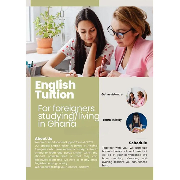 For foreigners in Ghana looking to improve their English language skills, Jemy Aimee Private Tuition offers specialized English tuition. Their experienced instructors focus on enhancing speaking, reading, writing, and comprehension skills, making