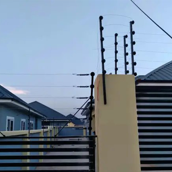 An electric fence serves as a security barrier, deterring intruders by delivering a non-lethal electric shock.