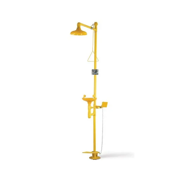 The JTS 6250 GI Safety Eye Wash Shower is a robust industrial emergency safety solution designed to provide immediate decontamination in hazardous environments. Built in compliance with IS: 10592:1982 standards, this dual-function unit features a high-visibility yellow ABS drench shower head and a durable ABS receptor bowl, both resistant to acid, alkali, and oil exposure. The shower is operated via a pull rod, while the eye wash is activated by a convenient push plate or foot pedal for hands-free emergency use. Constructed with a powder-coated galvanized iron (GI) pipe for corrosion resistance and equipped with a stainless steel stay-open ball valve, this safety station is ideal for laboratories, factories, and industrial facilities prioritizing worker safety.