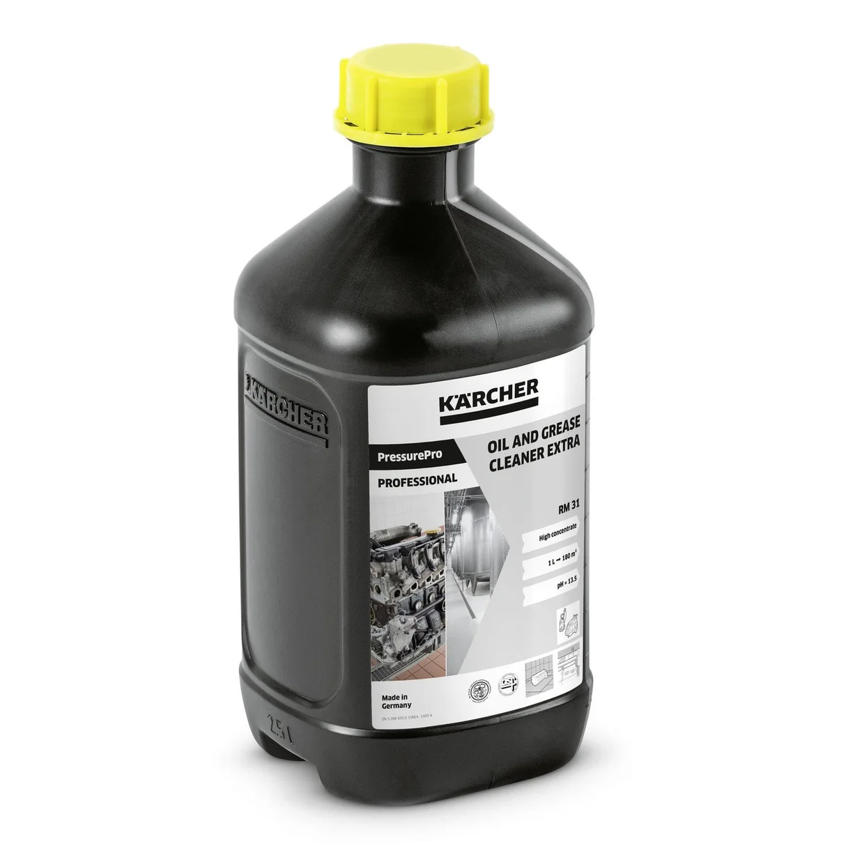 The Karcher PressurePro Oil and Grease Cleaner Extra RM 31 is a high-performance cleaning agent specially formulated to remove stubborn oil, grease, tar, soot, and smoke resin from vehicles and industrial surfaces. Effective across all temperature