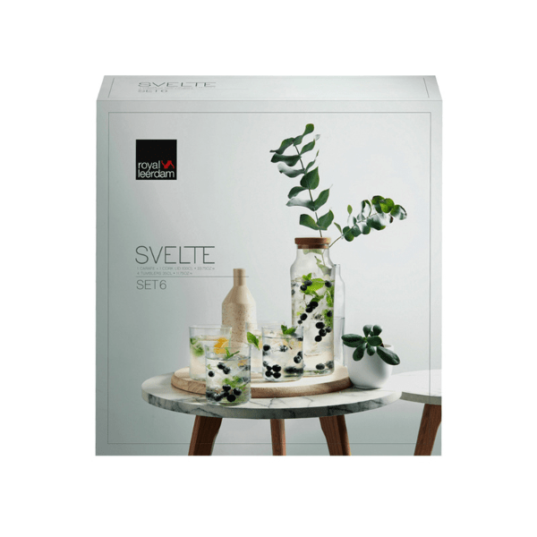 Bring sustainable elegance to your table. This set includes a 1000ml carafe and four 350ml tumblers, all featuring natural cork details. The biodegradable cork adds a warm, organic touch. The set is versatile for water, juices, or cocktails and is