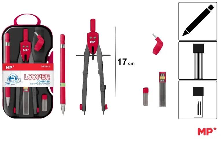 The Looper Bow Compass Set is a complete 5-piece drawing kit designed for precision and convenience. It includes a bow compass, mechanical pencil, marker adapter, pencil case, and pencil sharpener ? all neatly packed in a durable plastic case. Per