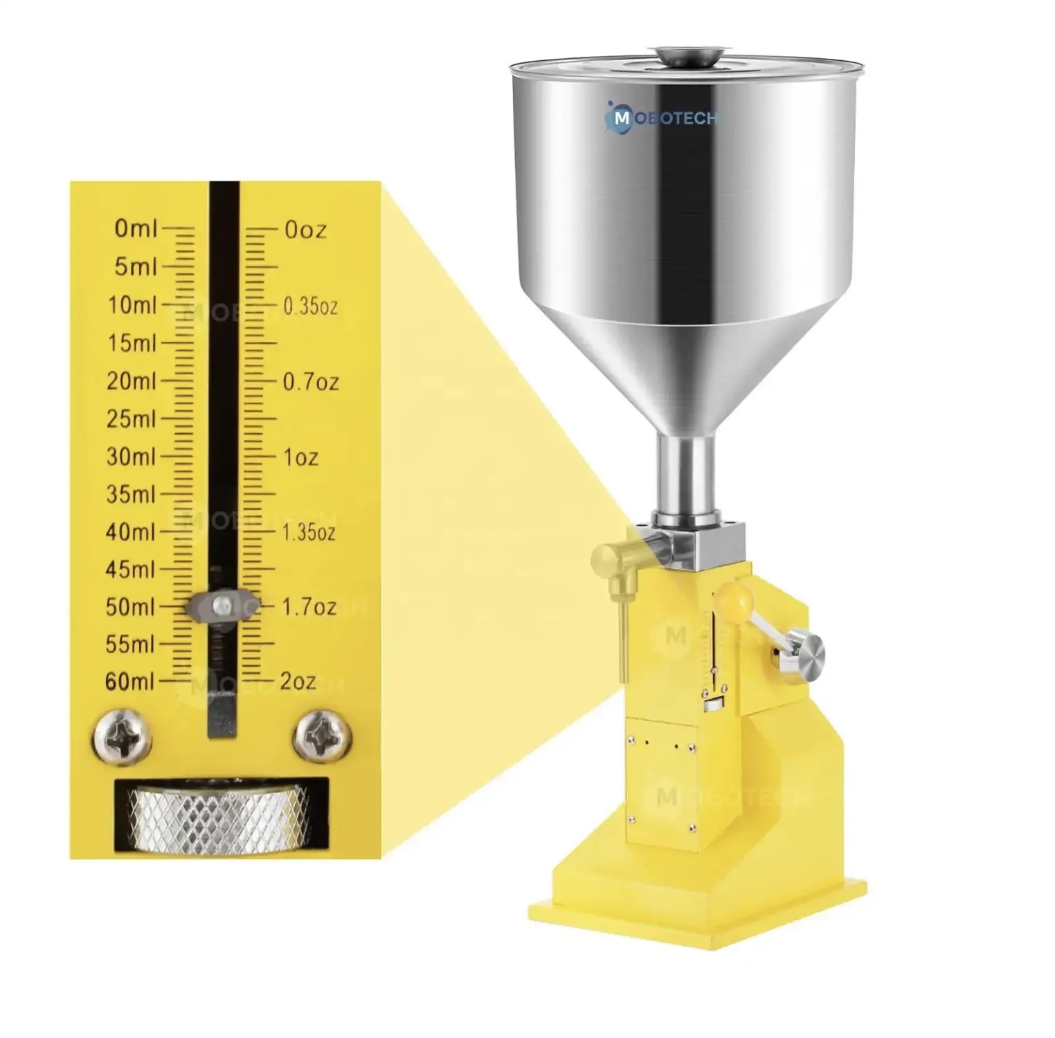 The A03 Manual Filling Machine with Scale is a semi-automatic solution designed for accurately dispensing liquids, creams, pastes, and semi-viscous products like honey, sauce, or oil. With a 15L hopper and a capacity of up to 200 bottles per hour, it is ideal for small-scale manufacturing, food and beverage shops, restaurants, and home use. This compact, easy-to-operate machine requires no electricity and supports a variety of packaging materials, including glass and plastic. Built by Mobotech, it offers a filling accuracy of less than 1% and is best suited for applications in the beverage, food, cosmetics, and chemical industries.
