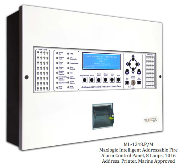 The Maxlogic Marine Approved Addressable Fire Alarm Panel is a high-performance, fully intelligent control panel built to meet the most demanding fire protection needs on marine vessels and large-scale land facilities. With support for up to 8 addressable loops and 1,016 addresses, it is an ideal solution for complex installations that require robust fire detection, centralized monitoring, and compliance with international marine and fire safety regulations.