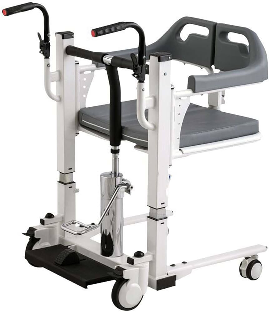 The Adjustable Patient Transfer Lift Chair is designed to assist individuals with limited mobility in transitioning between seated positions safely and comfortably. Featuring a 180? split seat that facilitates easy patient transfer, this chair can be used as a bedside commode, portable toilet, or mobility aid, making it versatile for various care settings. The seat height is adjustable up to 23 inches, accommodating different user needs. Equipped with a secure locking system, including front and rear belts, it ensures the safety of the user during transfers. The chair's braking system, along with its sturdy frame, provides stability and control. Ideal for use in hospitals, nursing homes, and home care environments, it supports users up to 220 lbs.