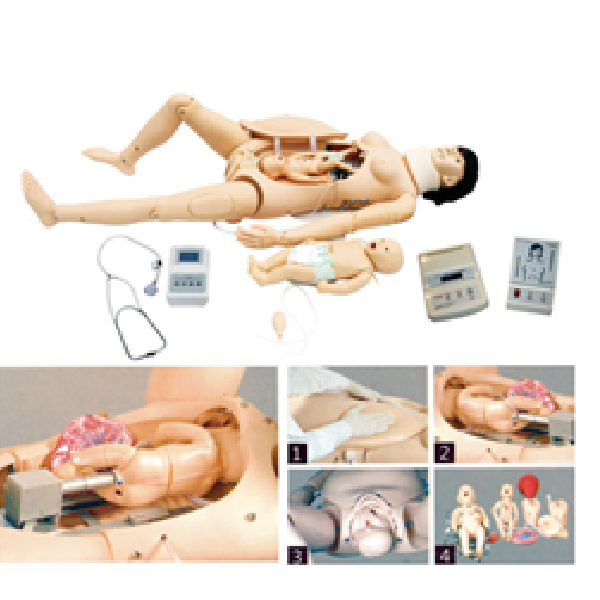 Key features include the simulation of both normal and complicated deliveries, such as breech birth, umbilical cord prolapse, dystocia, cesarean section, preeclampsia, and postpartum hemorrhage. The system also features a delivery process and fetal heart sound controller with adjustable heart rate (80–180 bpm), cervical dilation stages (0–10 cm), and a mechanical transmission with elastic adaptors to simulate both head-first and breech deliveries. Training functions such as a Leopold maneuver cushion, tracheal intubation, venous access in the maternal arm, vulvar suture practice, and full CPR capability based on international guidelines are also integrated into the maternal model.