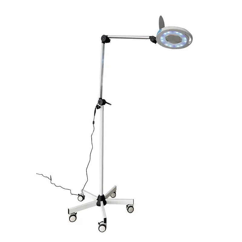 The EL-Q03 Magnifier LED Examining Lamp is a high-performance auxiliary lighting tool designed for precision tasks such as medical examinations and clinical procedures. Featuring a 140 mm lamp diameter and delivering 2200 lumens of adjustable brightness, it provides optimal illumination with a color temperature range of 2800–6500K. Its 5° focused light angle enhances visibility of fine details, while the high-quality acrylic lens and USA PURY chip ensure clarity and durability. Constructed from robust aluminum alloy with a stainless steel base, the lamp is height-adjustable and mounted on five smooth-rolling casters for easy mobility. Operating at AC180–260V and 300mA/W ±5%, with a power capacity of 12 ±3W, it offers a reliable and energy-efficient solution for healthcare settings.