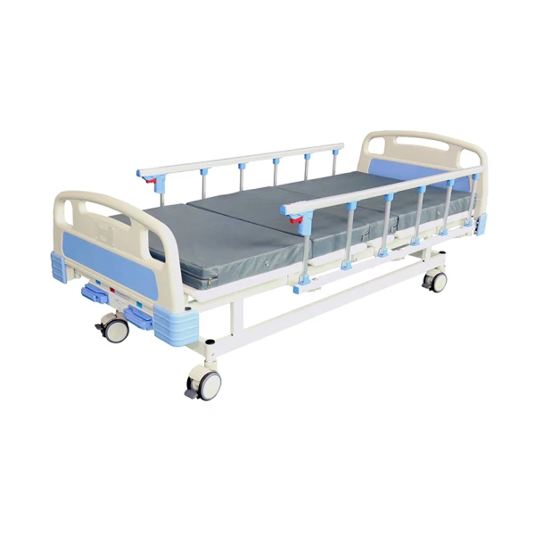 Patient safety is prioritized with a pair of ABS head and footboards featuring integrated name card holders, along with six-crank aluminum alloy handrails. Mobility is facilitated by four silent 125 mm caster wheels, two of which feature cross brakes for secure positioning.