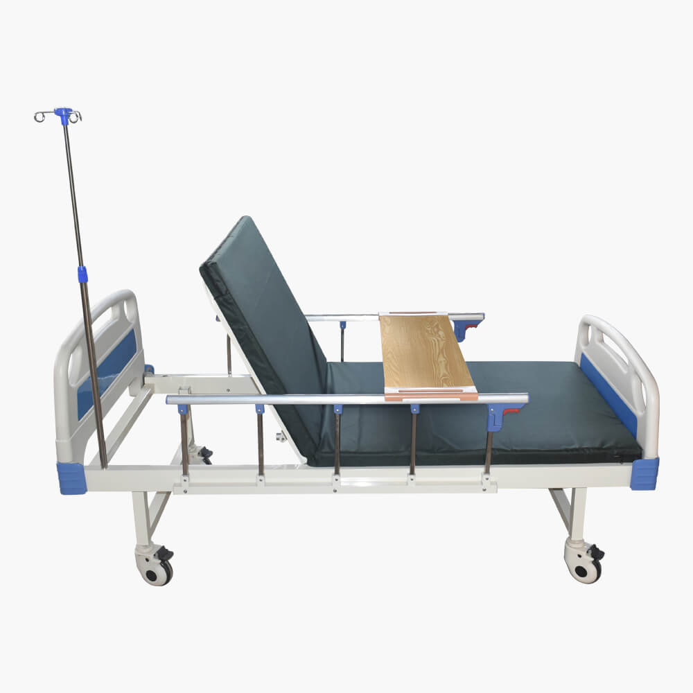 Mobility is facilitated by four 125 mm casters, two of which feature locking brakes for secure stability. For added safety, the bed includes a 5-speed guardrail system and durable plastic head and footboards. An infusion stand is also included to support patient care needs.