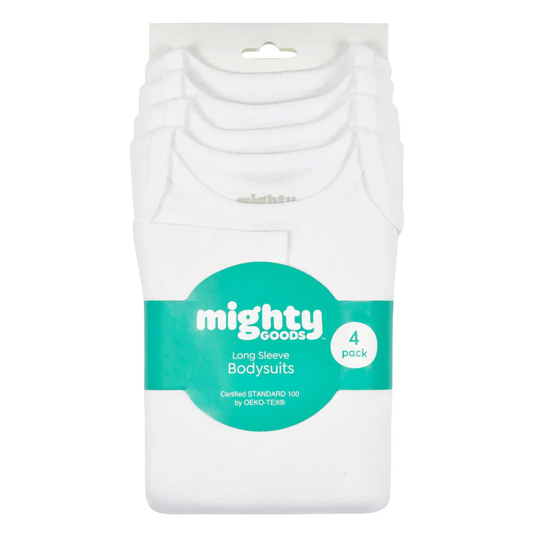 Build the perfect baby wardrobe foundation with these essential Mighty Goods long sleeve bodysuits. This practical 4-pack features premium 100% cotton onesies that are soft against delicate skin and ideal for layering or wearing alone. The thought
