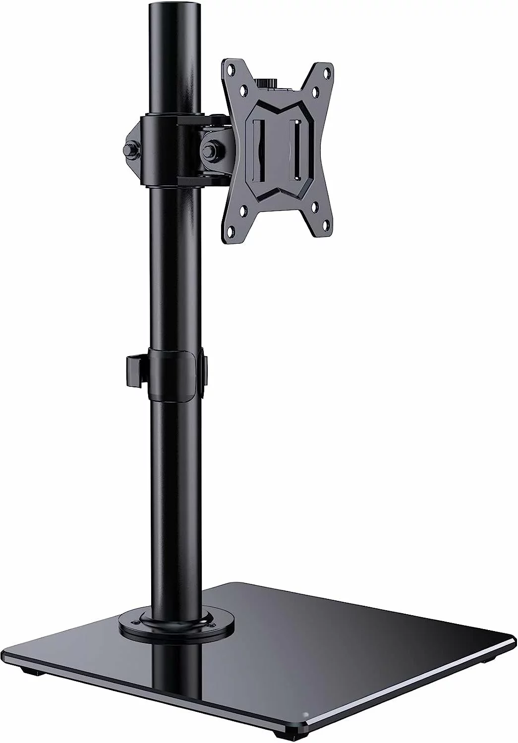 Ergonomic single monitor stand for screens 13-32" up to 8kg. LCD desk mount with tempered glass base, VESA mount 75x75 or 100x100, flat surface compatibility, and height/swivel adjustability for better posture and workspace organization. Freestanding design for flexible monitor placement. Robust for business and personal use. Sold in Accra, Ghana.