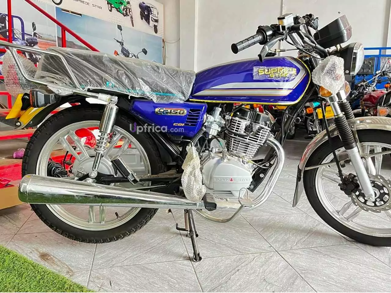 Two-wheeled motorbike with a durable metallic frame, 4-stroke engine, and saddle-style seat for easy maneuvering. Wheelbase 1260mm, net weight 93kg, max load 150kg. Available in blue color. Suitable for urban commuting and light cargo transport. Available in Accra, Ghana.