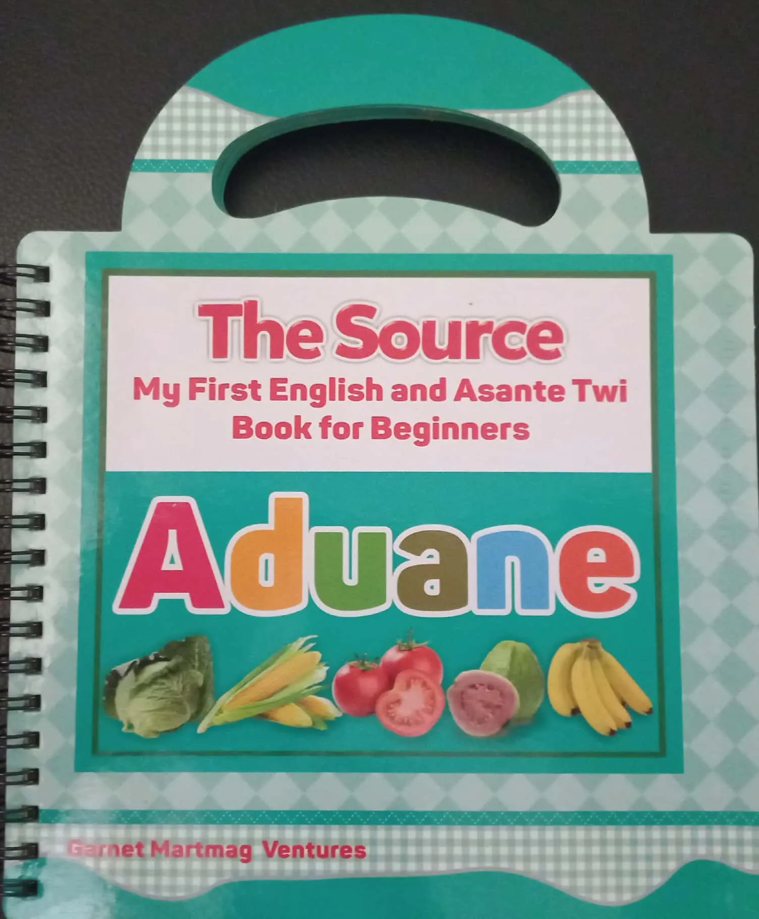The Source: My First English and Asante Twi Book for Beginners – Aduane is a bilingual board book that introduces children to common food names in both English and Asante Twi. D