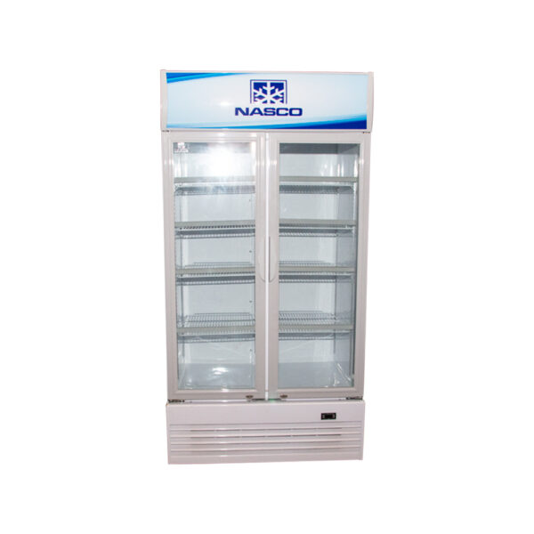 The Nasco NASD1-1000-2DR is a massive 750-litre display freezer designed for commercial use in supermarkets, butchers, or restaurants. Its large glass door showcases frozen goods clearly under bright interior LED lighting. The compressor-based coo