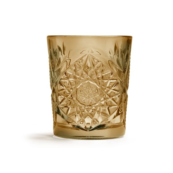 Elegant 355ml glasses with iconic Hobstar cut-glass pattern in rich ocher hue. Ideal for cocktails and whiskey, combining vintage styling with durable construction for hospitality and home use.