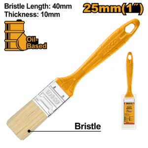 1-inch wide oil-based paint brush with 40mm bristle length and 10mm thickness. Features a unique design plastic handle for ergonomic grip and easy application. Bristles are suited for detailed edging and trim work. Packed by plastic bag for conven