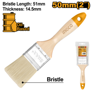 2-inch wide brush with wooden handle, 51mm bristle length, 14.5mm thickness. Optimized for oil painting on medium-size surfaces, window frames, or moldings. Packed by plastic bag to keep bristles in top condition.