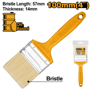 Specialty 4-inch oil-paint brush, 57mm bristle length, 14mm thick, with ergonomic plastic handle. Excellent for fast application over large wall areas and doors. Packed with retail label for builder’s markets and hardware stores.
