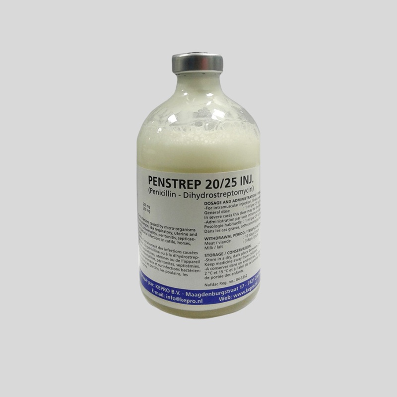 Penstrep 20/25 Injection is a powerful veterinary antibiotic combining Penicillin and Streptomycin, formulated for broad-spectrum control of bacterial infections in livestock. Effective against respiratory, skin, and systemic bacterial diseases, i