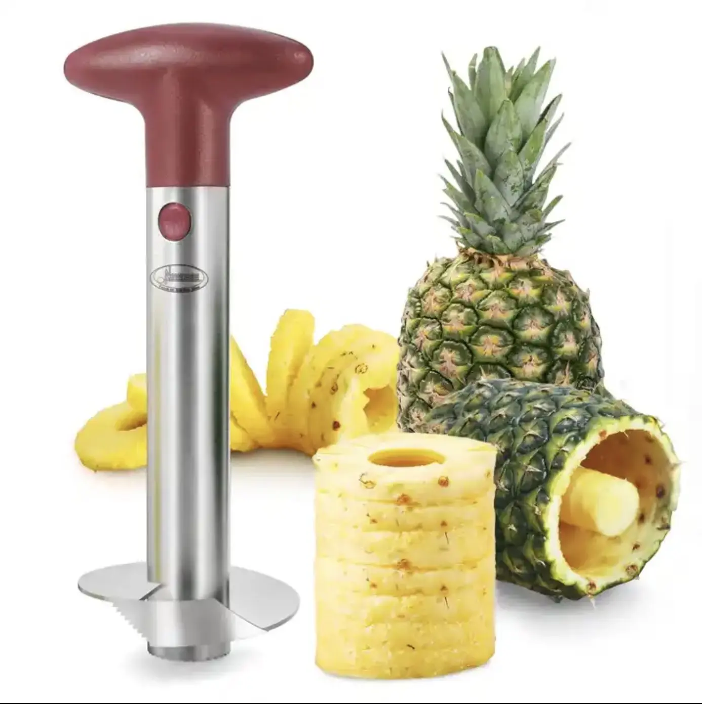 The Pineapple Cutter Core Remover Peeling Machine is a compact and efficient stainless steel kitchen tool engineered to peel, core, and slice pineapples quickly and with minimal waste. Ideal for both home kitchens and professional food prep settings, this user-friendly gadget simplifies pineapple preparation, delivering uniform slices with ease. Constructed from durable, food-grade stainless steel, it ensures long-lasting performance, effortless cleaning, and consistent results. Classified under fruit and vegetable tools—specifically melon scoops and ballers—this cutter is an essential addition for anyone prioritizing convenience, precision, and speed in their fruit preparation workflow.