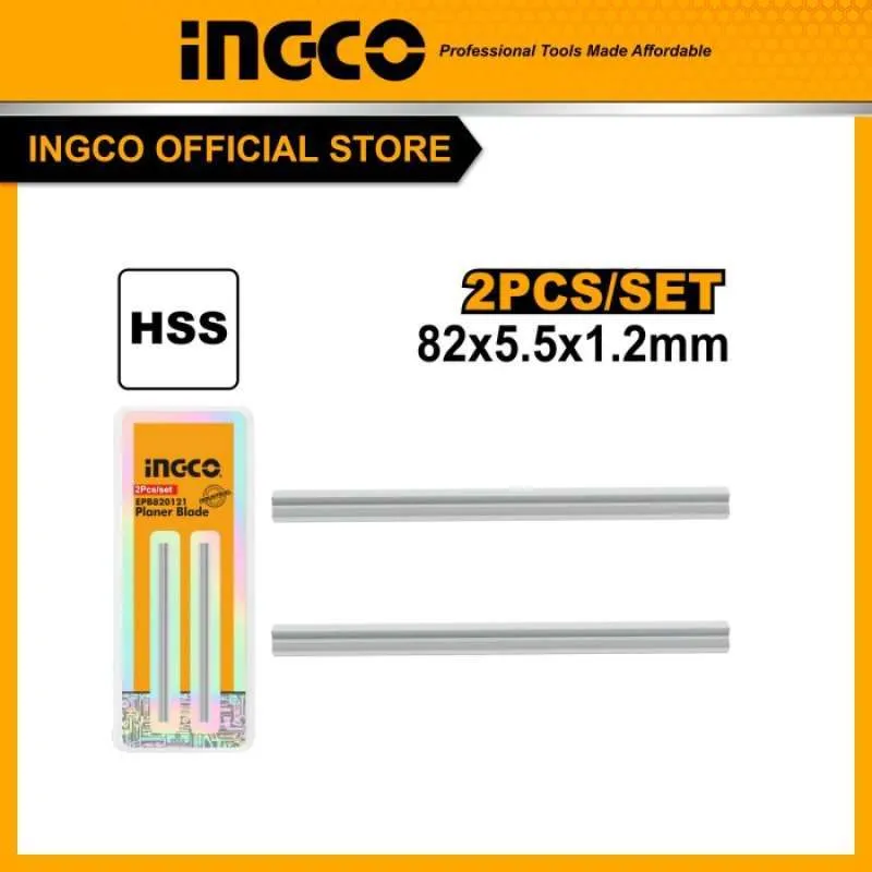 These planer blades measure 82mm by 5.5mm with a thickness of 1.2mm and are made from High-Speed Steel (HSS) for durability and sharpness. Each set contains 2 pieces and is designed specifically for use with the electric planer model PL10508. The blades are securely packed in a double blister for protection and easy storage.