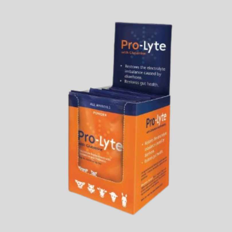 Prolyte is a palatable, apple-flavoured electrolyte supplement designed for all types of livestock. Formulated with electrolytes, glutamine, and probiotics, it helps stabilize water and electrolyte balance, supporting recovery from digestive disturbances such as diarrhea and vomiting.