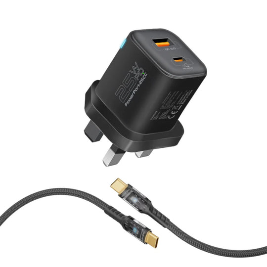 Fast-charge duo with glowing style — Promate 25W wall adapter (PD 25W + QC 18W); 1.2m USB-C to C 60W cable with transparent LED connectors. Nylon braid; 480Mbps data. Overcharge/short-circuit protection. For S23, iPhone 15, laptops. Ideal for Ac