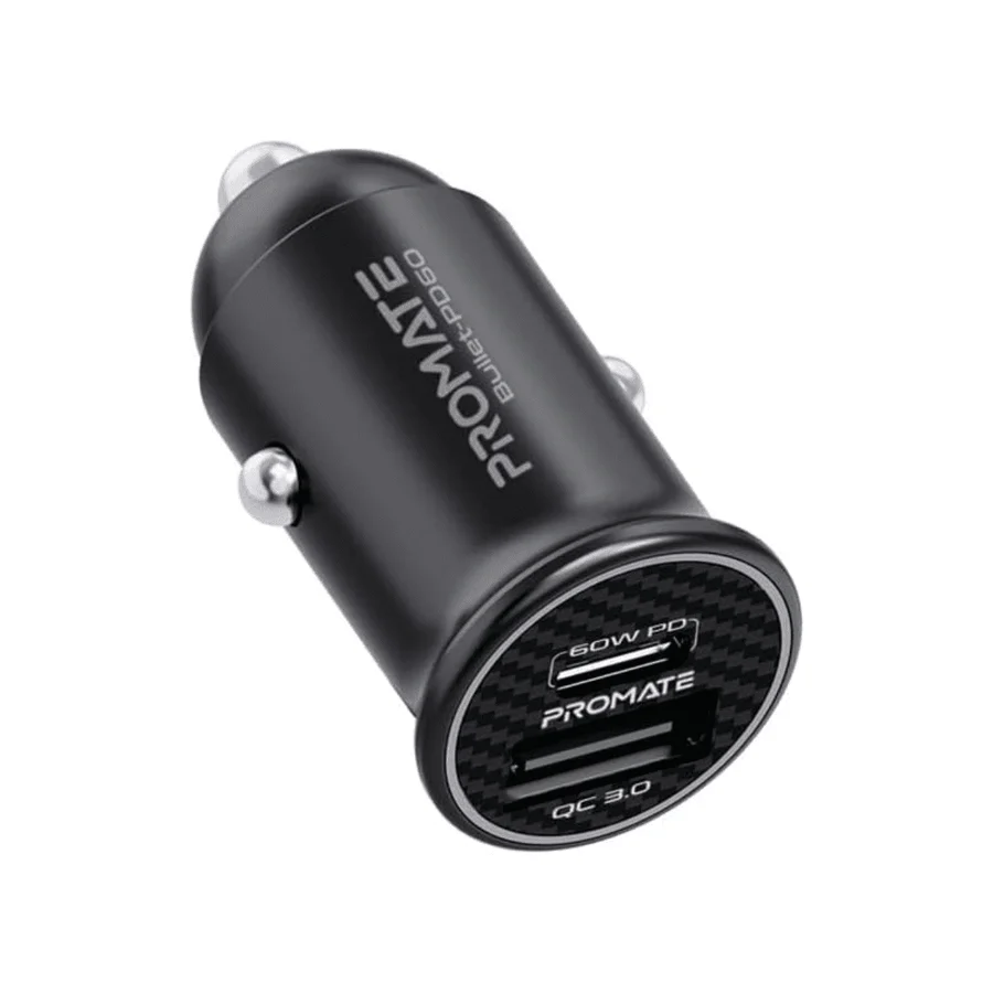 Supercharge your devices on the go with the Promate Bullet-PD60 Mini Car Charger. Equipped with 60W Power Delivery and Quick Charge 3.0, this dual-port charger powers laptops, smartphones, and tablets up to 10X faster than conventional chargers. Its compact design and premium heat-dissipation material ensure safe, efficient, and reliable charging during your drive.