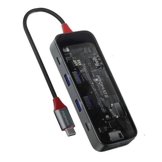 Tempered-glass 100W future dock — Promate USB-C; HDMI 4K@60Hz + 1Gbps RJ45 + 3x USB 5Gbps + SD/TF 2TB + 100W PD. Transparent tech marvel—connectivity redefined!