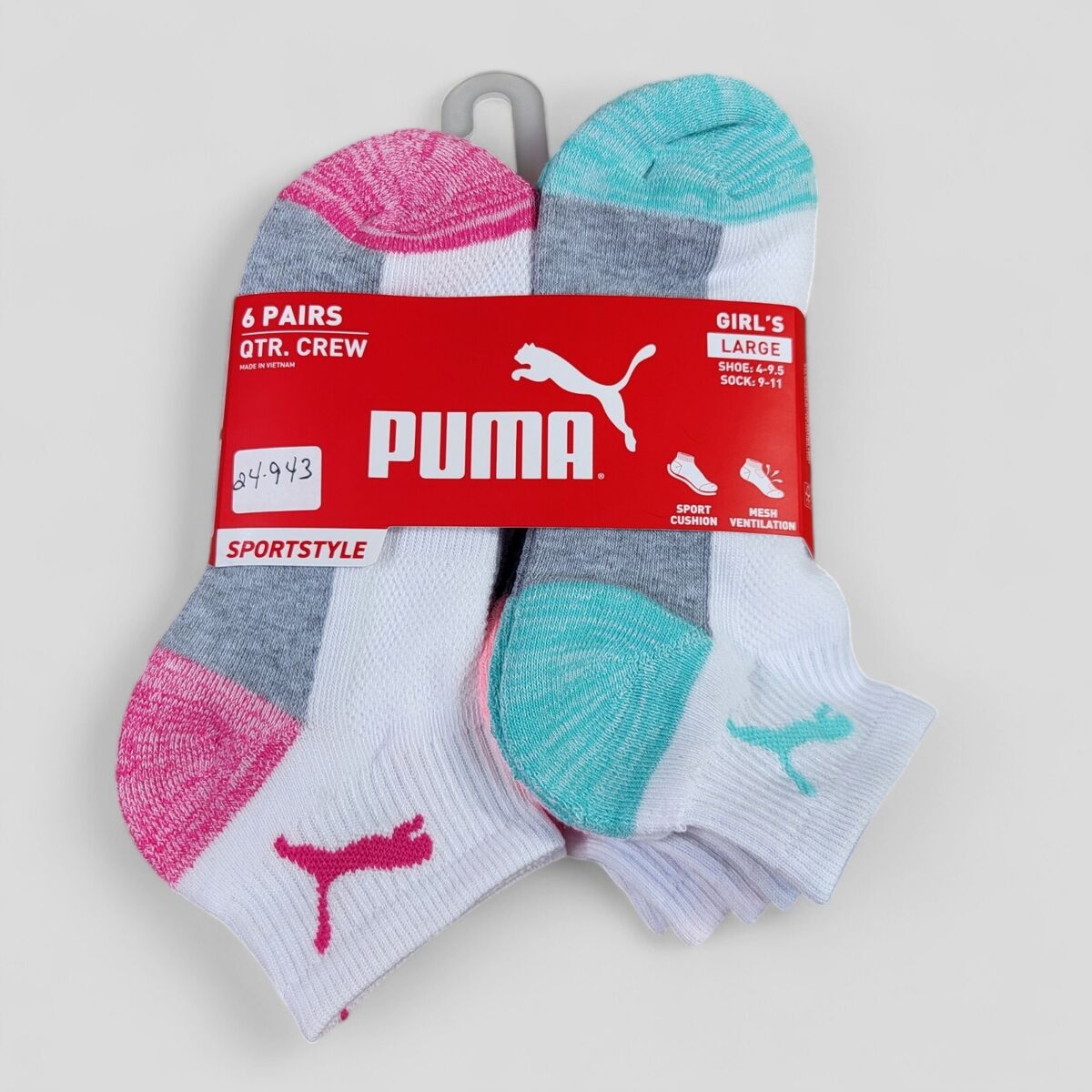 Keep your active girl prepared with this 6-pack of PUMA Sportstyle no-show socks, designed specifically for girls' shoe sizes 4-8.5. These premium socks disappear into shoes while providing all-day comfort and support. Made from a breathable cotton blend, they keep feet cool and dry during sports, school, or everyday adventures.