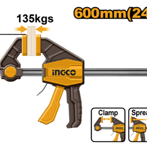 Heavy-duty quick bar clamp with 80x600mm clamping area and up to 135kg clamp force. Features a thicker (6x18mm) iron ruler bar for enhanced stability. Packaged by label.