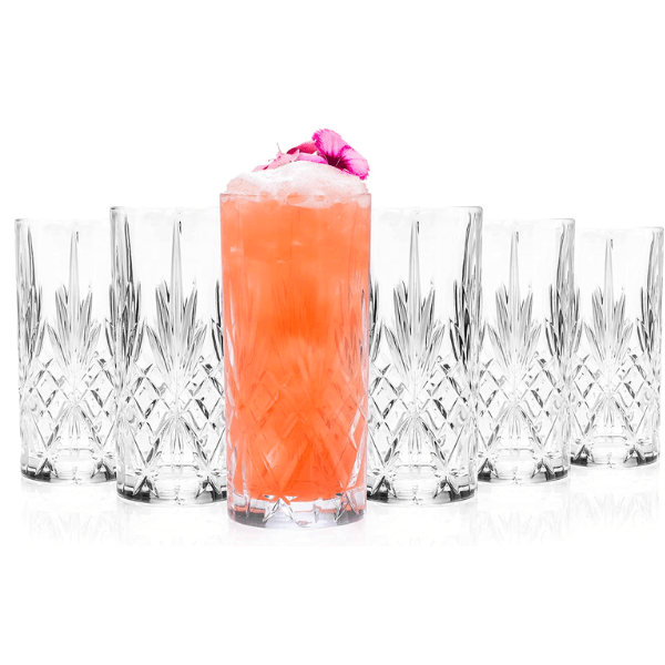 Elevate your barware with RCR Melodia Hiball Glasses. Expertly crafted in Italy from brilliant Luxion crystal, these glasses feature a timeless cut-glass pattern with modern twist. Perfect for cocktails, soft drinks, or water, the set of 6 offers durability and stunning clarity for entertaining or daily use.