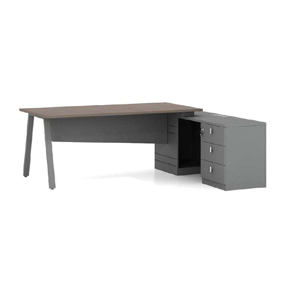The RESPECT Desk is a premium executive office workstation combining functionality and modern aesthetics. With a spacious 160cm x 160cm work surface, this walnut and grey desk is ideal for professional environments like offices, s