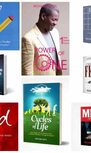 Richard Akita Set – 8 motivational paperbacks (Power of One, Cheat on Fear, etc.), 1,200 pages total, 50 vision board templates, ribbon bookmarks.